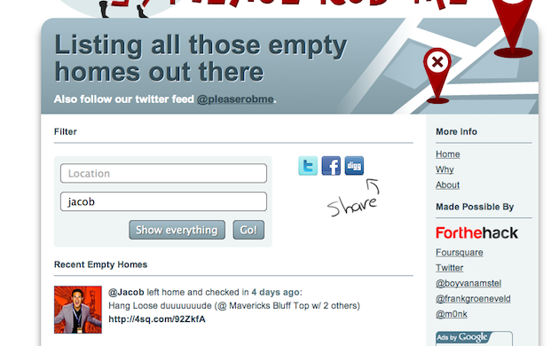 A new site throws this issue back into the spotlight in a humorous way. Please Rob Me is a stream of updates from various location-based networks (though right now all I’m seeing is Foursquare) that shows when users check-in somewhere that is not their home. The idea, of course, is that if they’re not home, you can go rob them.