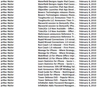 Today something new happened though. It wasn’t a PR firm we went to battle with, it was a press release distributor – prMac. I know these guys well, because for the last year and a half they’ve sent me an average of 15 emails a day, sometimes far more. Each email contains a useless press release that someone paid them to spam out to the media. As far as I know, not one of these emails has ever turned into a story.