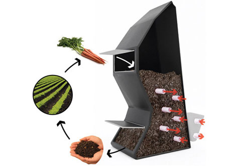 A steady supply of rich organic compost is extracted from a door at the bottom of each bin. It fertilizes new vegetation that will eventually become fuel for the next cold season. The concept is suited to large urban parks, community gardens, or even serving as an outdoor café – anywhere that generates a continuous supply of organic waste for fuel.