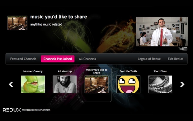 I love Redux on Boxee. It takes the pressure off me to decide exactly what I want to watch, and gives me channels of content around some of my favorite subjects like WTF videos or great music. Redux is pushing the limits of the space and really experimenting with what TV could be.