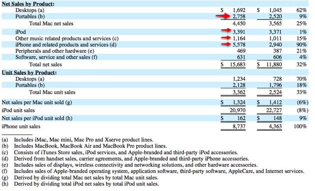 Cook also pointed out that the majority of Apple’s revenues now comes from mobile devices (including laptops) or content for those devices. Indeed, if you look at the breakdown of Apple’s fourth quarter revenues of $15.7 billion, nearly $12 billion of that came from portable Macbooks ($2.8 billion), iPods ($3.4 billion) and iPhones $5.6 billion). And another $1.2 billion came from iTunes.