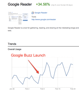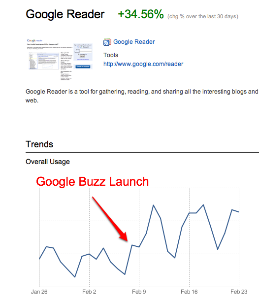 Social sharing is becoming a big contributor to traffic for many sites. While Facebook and Twitter drive more sharing than any other services, Google is trying to compete with Buzz, which is now part of Gmail but shares links to article and blog posts through Google Reader. Over the past month, according to AddThis, sharing through Google Reader is up 35 percent, with a big jump on February 9, the day Buzz launched. This number only measures sharing through the AddThis button, which is on more than 600,000 Websites and gives you the option to share content through more than 200 services. So it is only a proxy for total sharing on Google Reader, but a decent one.
