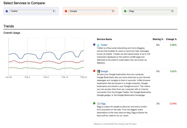 You can now chart how different services do against each other on the sharing front via a new services directory on AddThis. For instance, Google Bookmarks does much better than Google Reader, with 5 percent of all AddThis activity. It even beats Digg (which has 3 percent). Google Bookmarks is probably used more for personal bookmarking than for social consumption, but it is smack in the middle of Twitter and Digg when it comes to activity via AddThis.