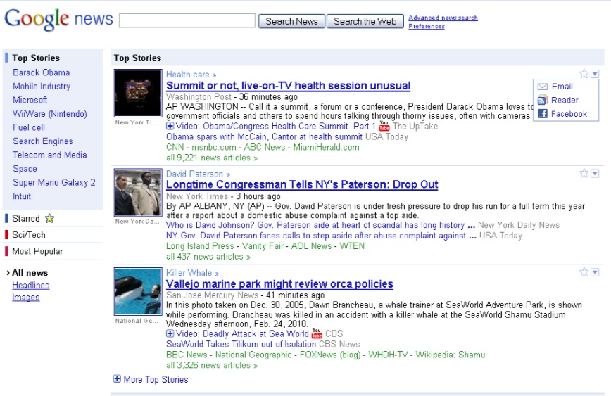 Google News is testing out a new design, as I reported earlier this month. It includes trending topics on the left and new personalization options. But today someone in the bucket test noticed something different. The sharing options changed. Each story can be shared via email, Google Reader, or Facebook.