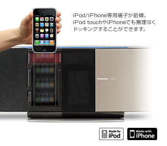Open the “door” to find a dock in which you can put your iPhone or iPod, which you can then control remotely (Panasonic calls this “Direct Docking”). You can also take your Apple player into your hand, choose what you want to hear and listen to the music through the D-Dock speaker. The device supports the iPhone 3G and 3GS plus the iPod, iPod classic, touch, nano, and mini (various generations).