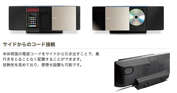 Panasonic in Japan has announced [JP] a new stereo system today, the D-Dock SC-HC40. The device is just 69mm thick at the thinnest part but integrates a speaker plus digital amplifier (20W×2ch(6Ω)), a CD player, an AM/FM tuner, an SD/SDHC/SDXC memory card slot, and a “sliding door” (Panasonic).
