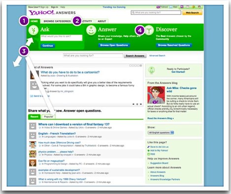 Navigation: The homepage’s navigation bar has four new tabs: Home, Browse Categories, My Activity, and About. Each of the tabs stays on every page you visit in Yahoo Answers. “Home” brings you to the homepage which includes a rotating Best of Answers feature, the link to the Answers Blog and more. “My activity” lets you access your Answers profile, and view your activity on the site. “About” features the Community Guidelines, answers leaderboard, Suggestion Board, and links to the Answers blog.