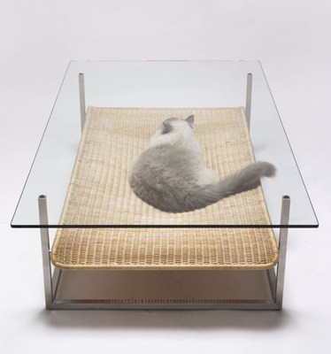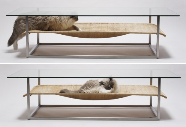 The truth is that cats will make themselves comfortable anywhere. On a bed of coals, or atop Mount Doom, or hurtling through space at 99% of the speed of light, a cat will somehow find a way to curl up and doze off. So the idea of including a special place for your cat to sleep underneath a perfectly good cat bed (in this case a glass coffee table) seems redundant. But let’s be honest — are you going to let a little redundancy keep you from buying a cat hammock?