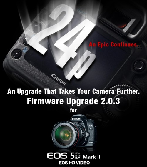 Good news for those of you shooting video on your 5D mk IIs — this month will bring the highly-anticipated 2.0.3 update, which improves a number of aspects of this already-excellent camera. A 24p mode has been added, thank god, which I know a ton of people were looking forward to — and 30p has been changed to 29.97 in order to be NTSC-compatible. Audio sampling has been bumped from 44.1KHz to 48KHz, which is nice, I guess. You can also manually control audio levels now.