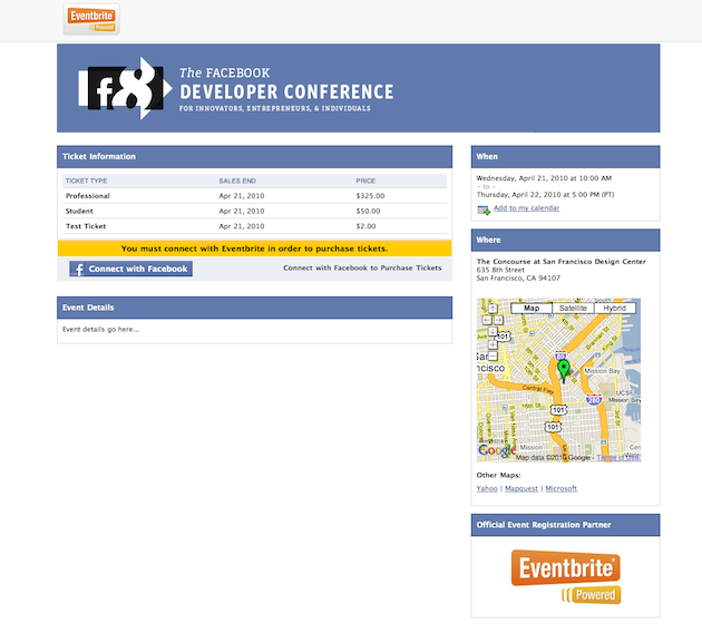 When asked why tickets were so expensive to Chirp, conference organizers noted that unlike f8, Chirp wasn’t accepting outside sponsors, which f8 has used in previous years to keep costs down. It’s not clear if Facebook is doing that again this year, but judging from the ticketing page, at least Eventbrite is a partner.