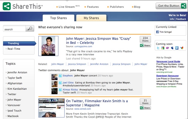 The way most people interact with these button is through widgets on publisher’s sites. But one of the largest sharing button networks, ShareThis, is about to turn that around and introduce a Share Stream which shows you what your Facebook friends are sharing across the Web. Soon your Twitter followers will be added as well (at launch you will only be able to see what everyone is sharing across Twitter). Of course, the Share Stream is also available as a customizable widget to show on any site.