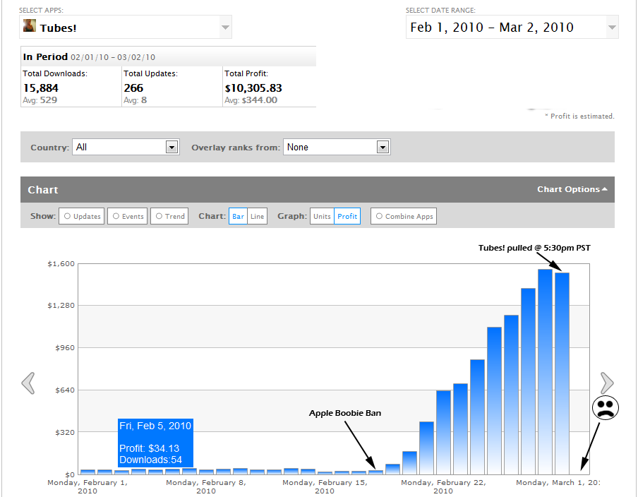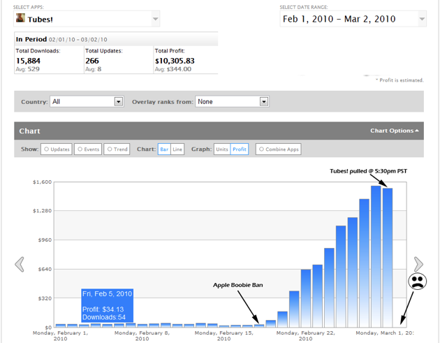 Before Monday, February 15, when the Apple sex ban started going into effect, Tubes was only pulling in around $30 a day. A day later, that number had more than doubled. As the days passed (and more sexy apps were removed), the application climbed up to a peak of nearly $1,600 a day. And then at 5:30 PM yesterday, Tubes! had its rise to glory cut short.