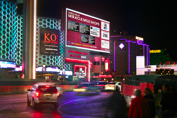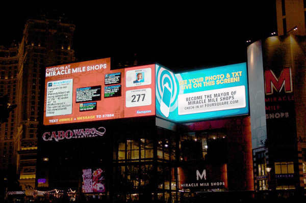 Yes, the pictures above and below were taken at the Miracle Mile Shops attached to the Planet Hollywood hotel in Las Vegas. As you can see, the huge ads entice users to check-in at the mall. If you do so, they might highlight your check-in, any tips, and even show who the current mayor (the Foursquare user who has checked-in most often) of the mall is prominently.