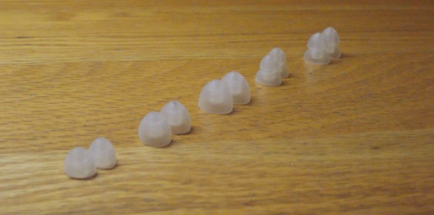 The X10i comes with 5 different sizes of tips. They range from small, medium, and large in a single flange design, to small and large in a double flange configuration. A good seal inside your ear is critical to bass response, as well as eliminating outside noise and that stethoscope effect. The best option for in-ears is to get a custom mold taken of your ear, and have the headphones made accordingly. But this is definitely the next best thing. The small, single flange was plenty big for me. I wore these things all afternoon without my ears getting sore, all the while making the screeching of the subway bearable.