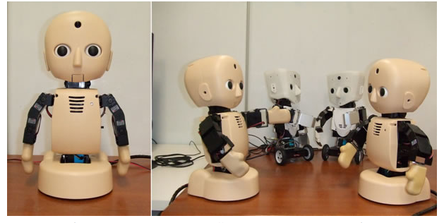 The robot stands 30cm tall and weighs 2.5kg. Synchy has a CCD camera with 3.3MP and a wide-angle lens in its head. Other features include 2 microphones, speakers, 15 LEDs (that make the robot’s face blush in certain situations) and a face and voice recognition function for other robots and humans.