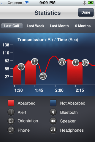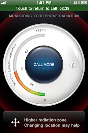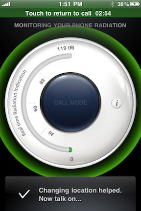 To find out what the radiation levels are during a call, the app lets users launch a call through the iPhone’s address book. It then monitors the radiation levels in real time and sends prompts via vibration and a tone should they reach the high-end of its threshold. The app also employs the iPhone’s proximity sensor and provides suggestions such as moving location, using a headset and even changing the iPhone’s orientation to your face.