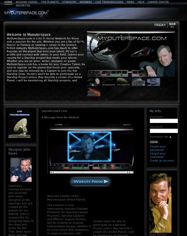 William Shatner will shill almost anything, and we love him for it. Now he is putting his promotional talents to work for Myouterspace.com, a social network for sci-fi geeks, gamers, animators, writers, and actors. In other words, people who couldn’t get into MySpace.