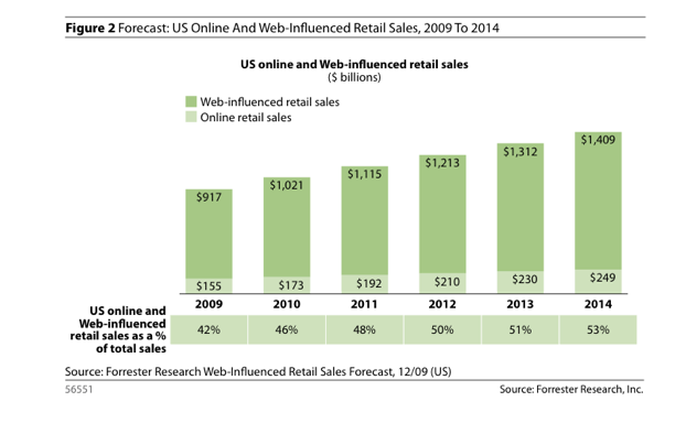 While $155 billion worth of consumer goods were bought online last year, a far larger portion of offline sales were influenced by online research. Forrester estimates that $917 billion worth of retail sales last year were “Web-influenced.” It also estimates that online and Web-influenced offline sales combined accounted for 42 percent of total retail sales and that percentage will grow to 53 percent by 2014, when the Web will be influencing $1.4 billion worth of in-store sales.