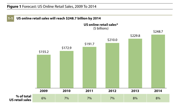 Online retail sales aren’t growing at the torrid pace they once were, but they continue to grow steadily. Forrester Research put out a new five-year forecast today predicting that e-commerce sales in the U.S. will keep growing at a 10 percent compound annual growth rate through 2014. It forecasts online retail sales in the U.S. will be nearly $250 billion, up from $155 billion in 2009. Last year, online retail sales were up 11 percent, compared to 2.5 percent for all retail sales.
