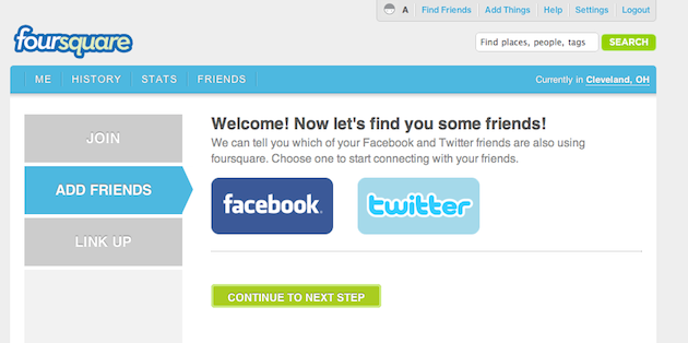 The biggest part of the changes currently rolling out is to the sign-up page. The new step-by-step process looks highly influenced by Twitter’s sign-up page (which they too tweaked a few times over the years). The process now allows you to sign up, easily find friends already using Foursquare via Twitter or Facebook Connect, as well as link up to those aforementioned networks. After you do that, there’s a one-page rundown of what you can do with Foursquare (such as download one of the mobile apps, earn badges, and explore cities).