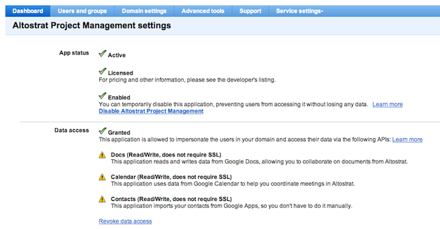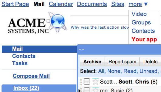 Once an app is hooked in to Google Apps, it will appear on your main Apps Dashboard alongside the other Google-made apps you use. It will even appear in the “more” drop down that Google uses in the toolbar across its properties. And because these apps are so tightly woven into Google Apps, they can take advantage of the built-in Google Apps such as Gmail and Gtalk to easily communicate within the third-party apps.