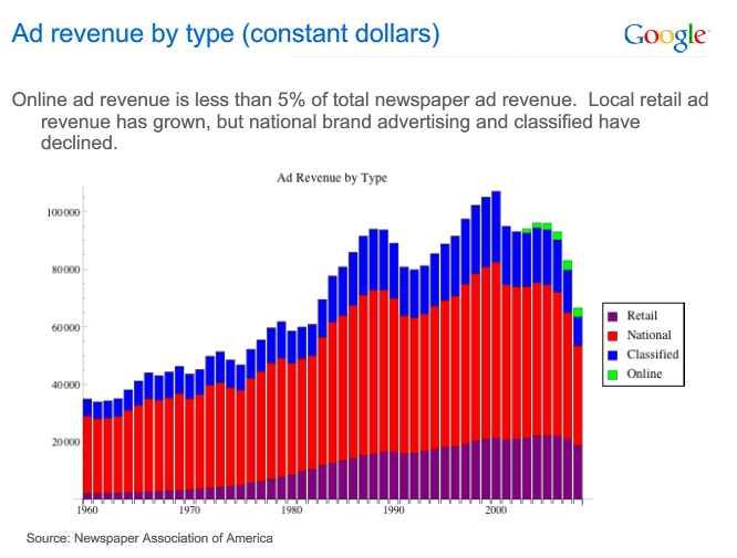 Earlier today, Google chief economist Hal Varian gave a presentation to an FTC workshop on the changing economics of the newspaper industry. We all know that newspaper ad revenues have been falling off a cliff for years. Many media companies blame Google and are trying to put the genie back in the bottle with partial metered models for online news.