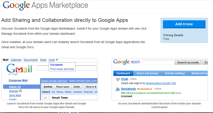 Socialwok in the the Google Apps Marketplace allows organizations to use their existing Google Apps accounts to login into Socialwok and create a social network for their domains to share within Google Docs, Google Calendars, Google Spreadsheets and other Google objects in feeds. For example, with the Socialwok Gmail gadget, users can view, post and comment on various feeds in their organization right from Gmail.