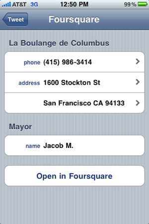 When you click on a Foursquare link, you’ll be taken to a page that shows the venue’s address and phone number as well as the Foursquare mayor of the place. If you click on the address you’ll load a Google Map showing you exactly where it is. If you click on the phone number, you’ll be able to call the place right from the iPhone. Below all of that, there is a button to open the venue in Foursquare, which launches the Foursquare iPhone app.