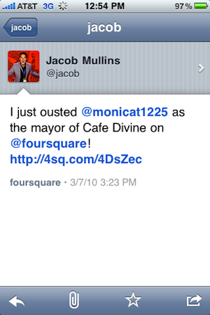 What this means is that anytime someone in your tweet stream sends out a tweet from Foursquare (which, to the annoyance of some users, happens automatically at times), that Foursquare link (shown as a 4sq.com URL) will be able to be opened in Tweetie in a way that displays the location information in a nice format. When a tweet is eligible for this feature, you’ll see a purple square logo in the upper right hand corner of the tweet in Tweetie.