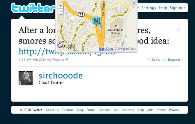 The timing of this move by Twitter is significant. Earlier today, the New York Times reported that Facebook would unveil its answer to location next month at its f8 conference. Twitter’s first-ever Chirp conference takes place just one week before f8. Google, meanwhile, is in the game with Latitude and to some extent Buzz (but could have been in it a lot more). And of course, every app and their mother appears to be launching with some sort of location functionality at the SXSW in Austin, Texas, which begins on Friday. Many of those apps use Twitter’s geolocation API to pass the data back to Twitter, so it makes sense that this would be a good time to turn the functionality on for the website.