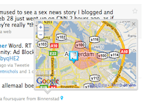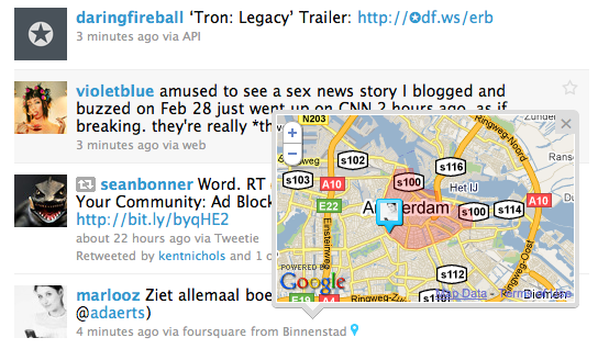 You can see these maps as overlays both on individual tweet pages, and on tweets in your main stream. In some cases, depending on how Twitter geolocation API is being used, it looks like place names are even passed through to Twitter. For example, here’s a tweet sent from Foursquare that also says where the tweet is being sent from.