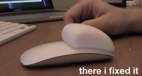 I handle a lot of mice in this job (right now I’m using the Mionix Naos 5000) and I have to say that if a mouse were, like the Magic Mouse, shaped completely wrong for human hands, I would throw it away and never speak of it again. Others, while perhaps more crafty, are far less principled, and will go so far as to fabricate a silicone crutch to rest their hand on. There, I fixed it!