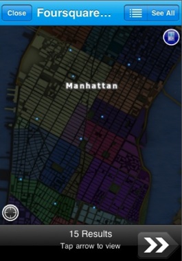 And what would an Austin update be without Foursquare integration. Once you log into Foursquare through UpNext you can see where all your friends are checking in. The checkins are overlayed as glowing blue dots on the map.