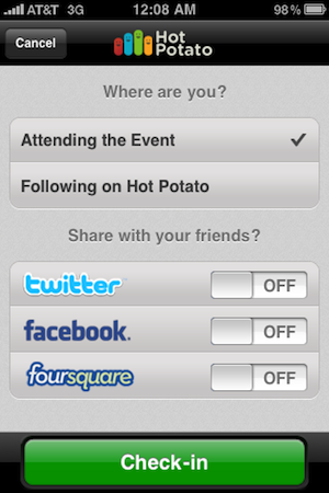 And here’s something that should really help Hot Potato this week: each time someone checks-in to a SXSW event with Foursquare, that service will recommend they also join the event on Hot Potato. Clicking on the accompanying link provided in the Foursquare app with open the Hot Potato app and let them join the event with a click (if they have an account). As you might expect, you can also check-in to a venue on Foursquare within Hot Potato. With Foursquare likely to be one of the key apps used by conference goers, this cross promotion is simply huge.