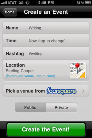 First and foremost, there is a new iPhone application that just went live in the App Store. With a completely revamped user interface, the app makes it easier than ever to find and participate in events. Perhaps more importantly, it makes it really easy to create new events — and notably, the service has the nicest third-party Foursquare integration I’ve ever seen. When you click on the button to create an event, you can still manually enter a location, but if you happen to be around the venue, you can simply pick it from Foursquare’s list of venues with the click of a button. This drastically simplifies the event creation process since the venue metadata is already there.