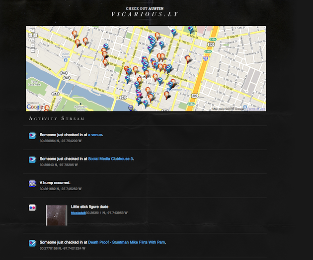 Vicarious.ly is a real-time location-based stream of information presented in a nice visual way. While the plan is to eventually launch one for many different cities around the U.S. and eventually the world, the first one is based around Austin, for SXSW. To make it, SimpleGeo partnered with BlockChalk, Brightkite, Bump Technologies, Flickr, Fwix, Foursquare, Gowalla, and Twitter to pull all of their location data and place it both in a constantly-updating stream, and put data points on a Google Map at the top of the page. These data points are represented by the logos of the various companies, so it’s easy to follow visually.