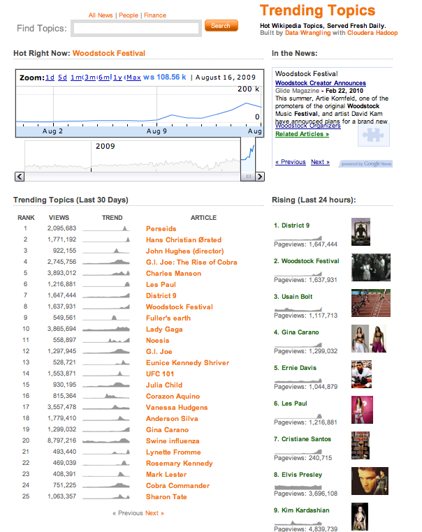 You can search for any topic, and the you will get a chart showing pageview trends, along with the actual article placed in an iFrame below the chart. It’s as good a way as any to explore Wikipedia. The site is built on Cloudera’s version of Hadoop.