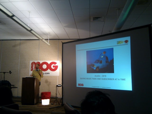 Hyman kicked off the talk with some background information. MOG Music Network, the editorial-based site hosted at MOG.com, reaches 16 million unique visitors a month. In December, the company launched Mog All Access, its streaming music service that costs $5/month for all-you-can-eat streaming music. The company is getting 17% conversion from its 3 day free trial (which is high). MOG, Hyman says, is a music service people will actually pay for. But the key will be portability.