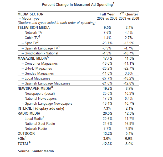 Print media were unsurprisingly hit hard, with measured ad spending in the Newspaper sector plunging by 19.7% in 2009.