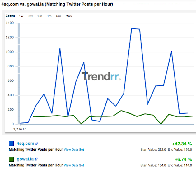 I had the service Trendrr send me some data for tweets being sent out with “4sq.com” and “gowal.la,” the short URLs for each service. As you can see in the graph above, while Gowalla has a much more steady stream of tweets sent to Twitter, Foursquare has huge spikes. In total, according to the Trendrr data, Foursquare is averaging about 500 Twitter posts per hour with peaks as high as 1,329 posts per hour. Gowalla is averaging about 100 posts per hour with a peak of 190 posts per hour.