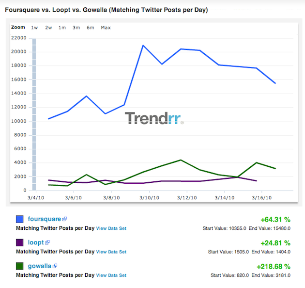 Trendrr also has more comprehensive data for the terms “Foursquare” vs. “Gowalla” (and they included “Loopt) on Twitter. There, as well, Foursquare dominates averaging about 20,000 posts a day, with Gowalla at just 3,000 a day (find that chart below). But that could also be because when Foursquare autotweets from accounts it includes the “@foursquare” branding on the end of the tweet while Gowalla does not.