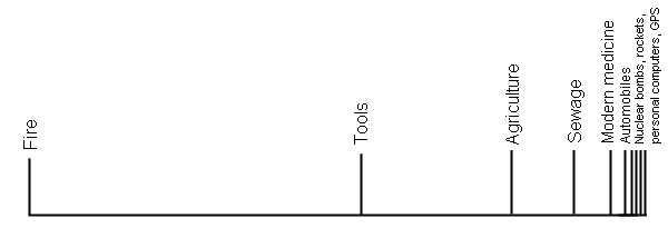 As even a casual student of history (read: a grade-schooler) can see, the rate of technological and cultural advancement has ever accelerated, of course with some interruptions due to warfare and subjugation. This is first observable in the length of “ages” — the stone age, 40,000 years. The bronze age, 2000 years. The iron age, 1000 years. There are too many books written on this topic for me to spend many words on this, and at any rate this acceleration is palpable to those of us living in the modern first world. Moore’s Law was once a simple prediction; now it’s practically a force of nature.