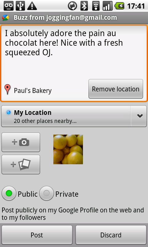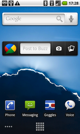 The new Google Buzz widget for Android allows you to post text or photos to the service without having to launch any app on the device. And, if you choose, you can easily tag your location to your buzz, as well as determine if it should be public or private. This widgets extends the already solid support the Android platform is offering the young service. For example, Buzz is built into Google Maps on Android, as well.