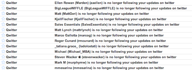 I’ve never been thrilled by the idea of Qwitter because it adds social pressure to Twitter. Without it, if you unfollow someone, they’re unlikely to notice (as Twitter won’t notify them). But with it, they’ll get an email and things may get, well, awkward. Likewise, getting an email letting you know that you’ve been unfollowed probably makes you feel a bit uneasy inside. Well, okay, unless it’s one of the thousands of spammy accounts on Twitter. Still, at one point they cared, and now they don’t.
