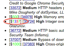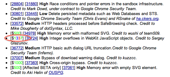 As noted on the Chrome Release blog, Google made four cash payments on Wednesday. There were two $500 prizes (both for memory errors), one $1,000 prize (for a cross-orgin bypass), and the first-ever $1,337 prize. The lucky receipient of that was a man named Sergey Glazunov, who located a bug that Google is calling, “High Integer overflows in WebKit JavaScript objects.”