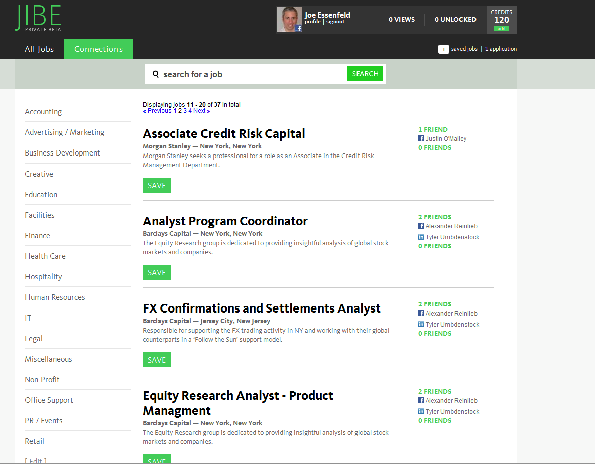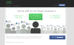 On Jibe, job seekers sign in with Facebook Connect. It pulls in their work and education history from their Facebook profile to pre-populate their Jibe profile. They can link their account to LinkedIn and Twitter as well (the service is targeting the 24-and-under crowd, who tend not to have LinkedIn accounts). Then for every job posting, they can see if they are connected to anyone at that company. Jibe allows members to message those people directly to ask for a recommendation or job advice.