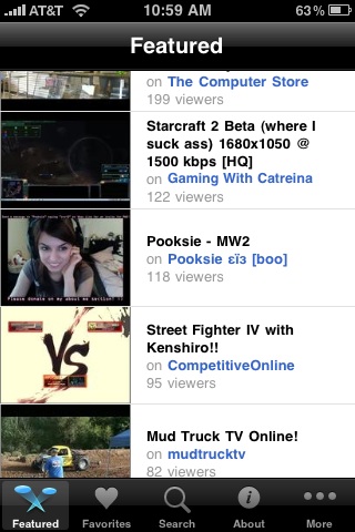 Justin.tv CEO Michael Seibel says they took their time with the app because they wanted to get it right. “We tried not to cut corners,” he says. All the live videos and channels available on the Website can be watched in the iPhone app. You can find videos by looking at the featured channels or by searching. Videos play horizontally in landscape mode, and text chat is built into the app. The chat text is laid across the bottom of the video and can be tapped on to make it disappear. And the audio works both with or without headphones, which apparently isn’t the case with all other iPhone video apps.