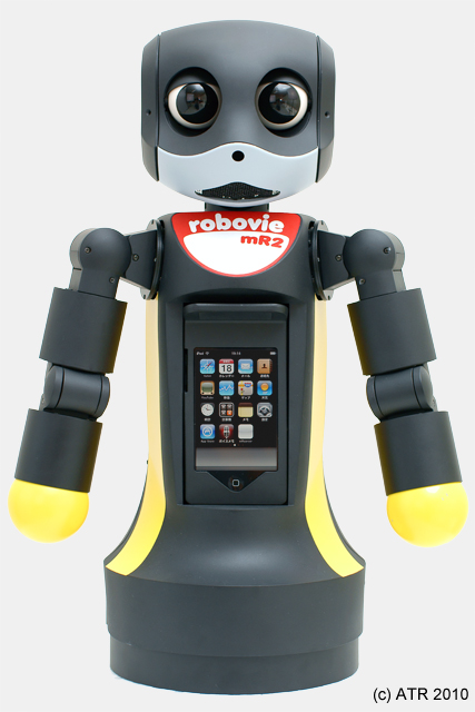 Japan’s Advanced Telecommunications Research Institute (ATR) has unveiled robovie mR2 [JP], a cute desk robot that stands just 30cm tall and weighs 2kg. The cool thing is that users can place an iPod touch in his chest to control the robot (via Wifi or by touching the screen).