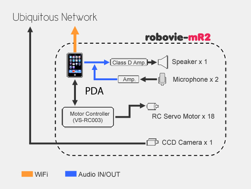 ATR says he can use “information gathered with the iPod by means of gestures”. Other features include a CCD 3.4MP camera, two microphones, a mono speaker (2W), 18 joints (3 in each eye), and 18 servo motors. The robot can also be controlled via Bluetooth.
