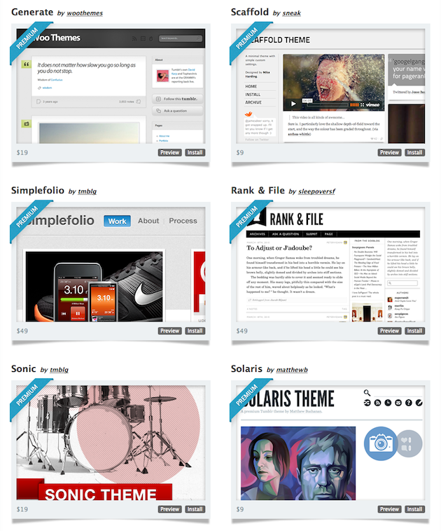 This seems like a smart play for Tumblr. One thing that separates it from rivals such as Posterous is the attention to design. Tumblr already features over 350 free templates that any user can install with the click of a button. “There’s already been a ton of demand for this platform [premium designs] from our developer community, and we know it will add a spectacular collection of new themes and options for our bloggers,” says founder David Karp.
